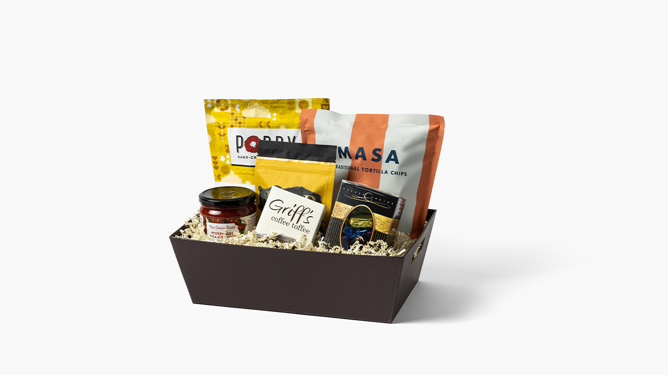 White cheddar popcorn, gourmet toasted pecans, masa tortilla chips, rich coffee toffee, decadent assorted chocolates, and zesty salsa.